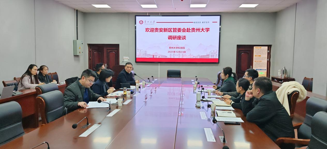 12月23日,贵安新区党工委委员、管委会副主任吴宏春率队莅临贵州大学科技园开展交流座谈,共商校地协同创新、产业赋能发展大计。贵安新区机关事务和法律服务中心副主任杨荣江、大数据和科技创新局副局长王文敬、花溪大学城管委会副主任陆秀峰陪同调研。贵州大学副校长王旭出席会议,贵州大学科研院副院长张晓培、科技园主任王爱华、副主任王贞超热情接待并参与座谈。